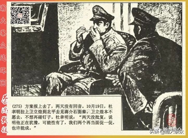 275 方案报上去了,两天没有回音。10月19日,杜聿明拉上卫立煌到北平去见蒋个石面奏,卫立熄本不愿去,不想再碰钉子。杜聿明说:“两天没批复,说明他正在犹豫,可能性有了,我们两个再当面促一促,也许能成。”