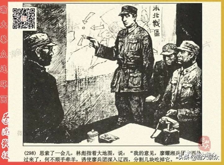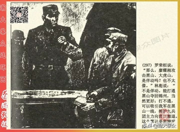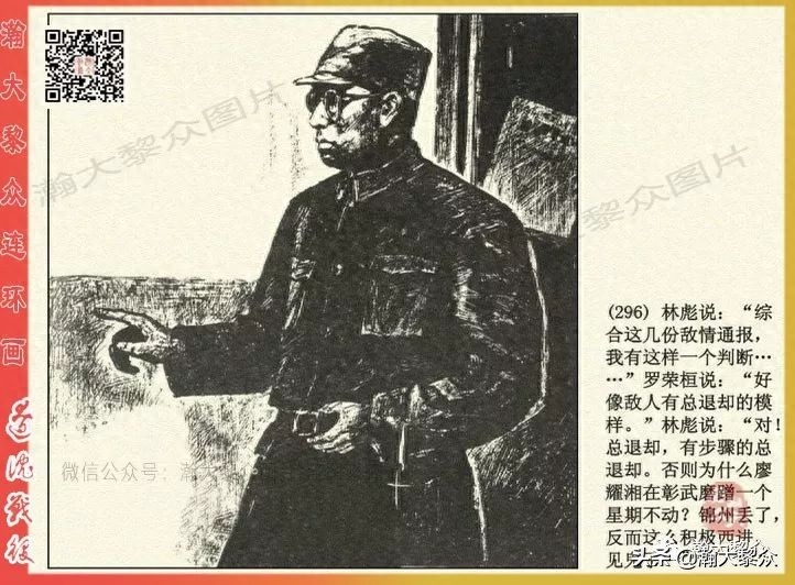 296 林彪说:“综合这几份敌情通报,我有这样一个判断….”罗荣桓说:“好像敌人有总退却的模样。”林彪说:“对!总退却,有步骤的总退却。否则为什么廖耀湘在彰武磨蹭一个星期不动?锦州丢了,反而这么积极西进,见鬼了?”
