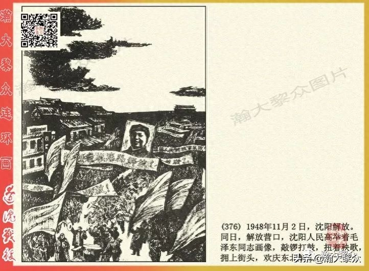 376 1948年11月2日,沈阳解放。同日,解放营口,沈阳人民高举着毛泽东同志画像,敲锣打鼓,扭着秧歌,拥上街头,欢庆东北解放。