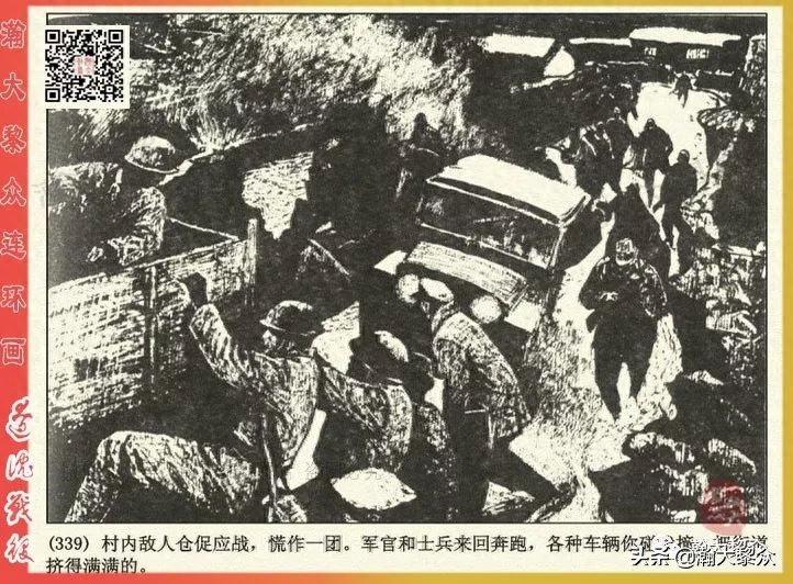 339 村内敌人仓促应战,慌作一团,军官和士兵来回奔跑,各种车辆你碰我撞,把街道挤满满的。