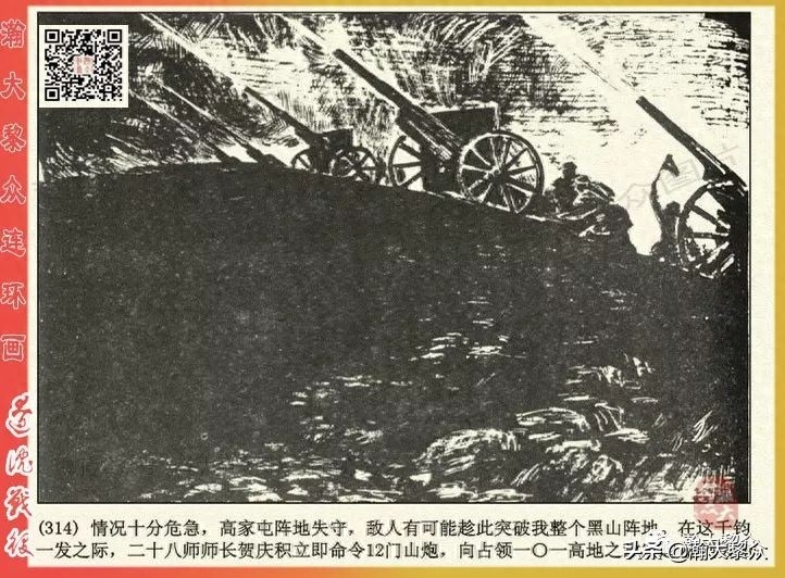314 情况十分危急,高家屯阵地失守,敌人有可能趁此突破我整个黑山阵地。在这千钧一发之际,二十八师师长贺庆积立即命令12门山炮,向占领一O一高地之敌发起猛烈轰击。