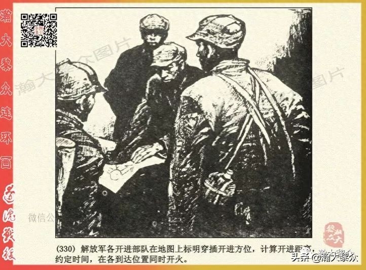 330 解放军各开进部队在地图上标明穿插开进方位,计算开进距离,约定时间,在各到达位置同时开火。