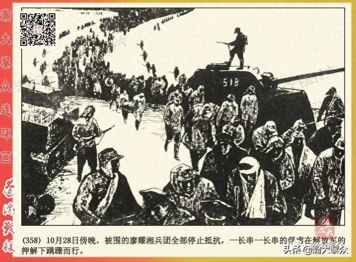 358 10月28日傍晚,被围的廖耀湘兵团全部停止抵抗,一长串一长串的俘虏在解放军的押解下蹒珊而行。