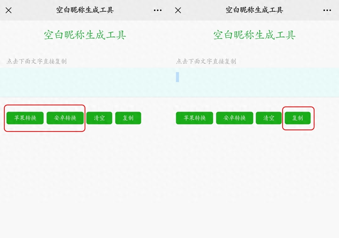 首先打开这一空白昵称生成工具,直达地址获取方法在文末。然后直接点击“苹果转换”或者“安卓转换”按钮,点击之后稍等一会儿,再之后点击最右侧的“复制”。