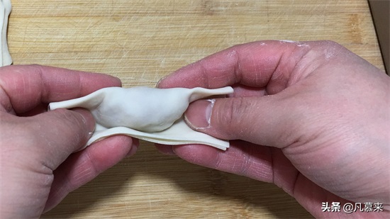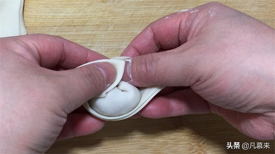 两头往中间收拢,捏紧,元宝型馄饨就包好了;