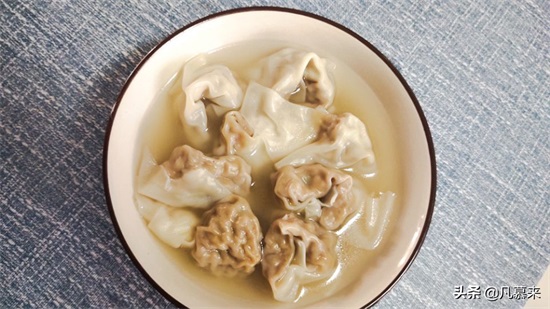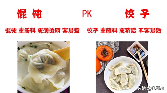 馄饨与水饺的区别:馄饨重汤料,而水饺重蘸料。馄饨皮一般比较薄,煮熟后的馄饨有透明感,容易熟,一般1-2个滚就可以煮熟,煮水饺过程中另需加入3次凉水,经历所谓‘三沉三浮’,方可保证煮熟。