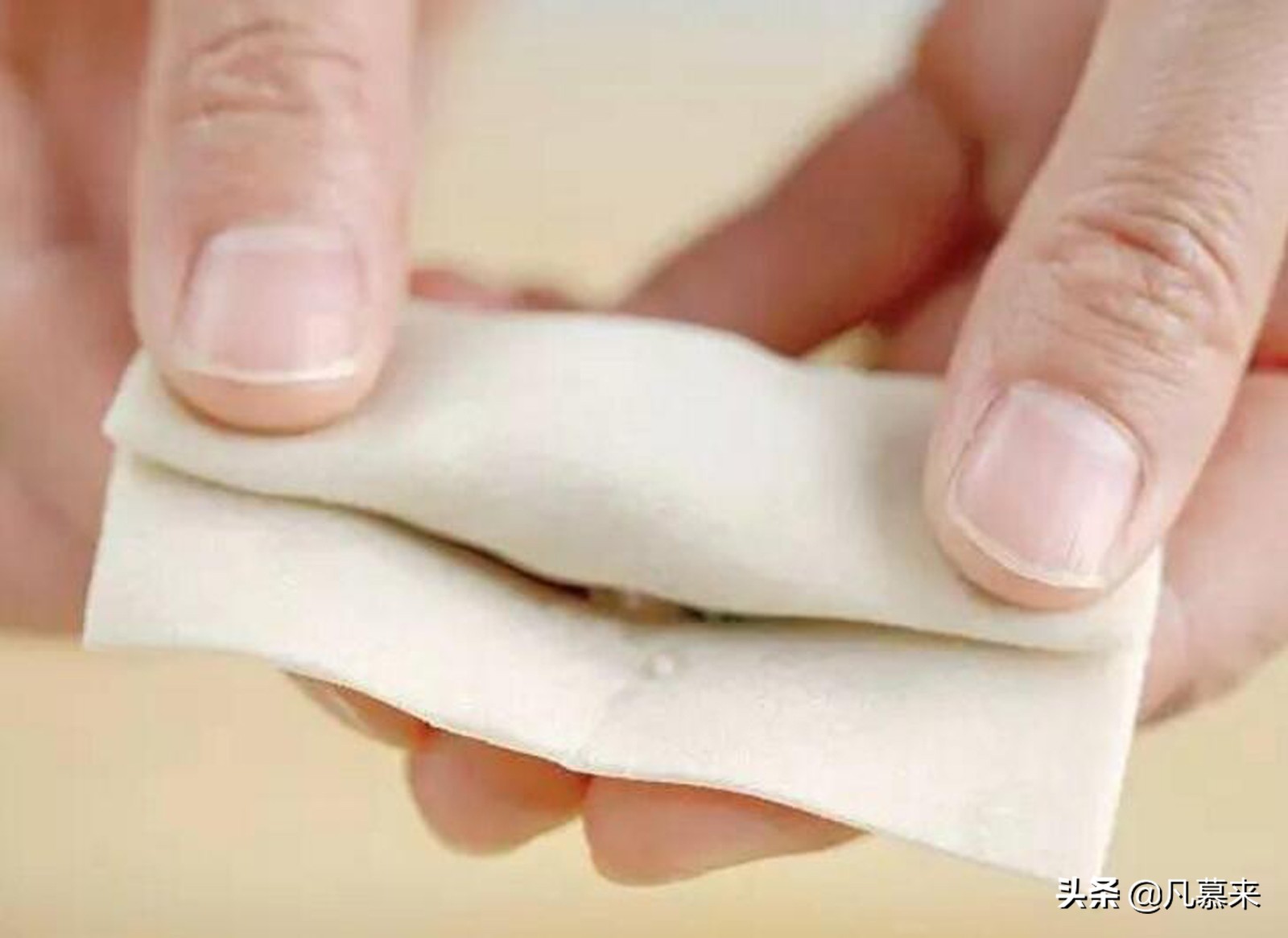 5、三角帽型:三角对折,然后边再捏在一起;这样的馄饨皮比较厚,比较筋道;