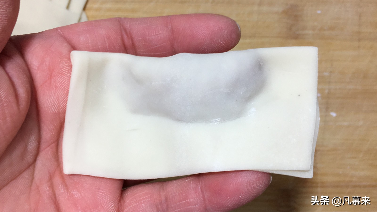 3、方形馄饨:把馅装成条形,从一侧向另一侧轻轻一滚;
