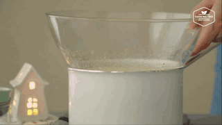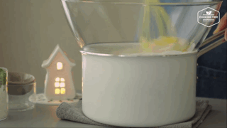 ▲加热打发好蛋液后取出热水,然后将装有牛奶黄油的碗放入热水中备用,等需要时取出。
