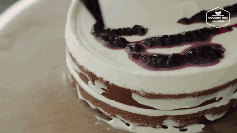 每一层的奶油上面可以挤上一圈蓝莓果酱,也可以将果酱与奶油混合,之所以分开是觉得有颜色层次感。如果不是自己熬的果酱,可以用罐装果酱,稍微兑一点水搅拌开来就好。