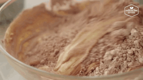 ▲接下来过筛入低粉与可可粉,用翻拌的手法翻卷均匀。