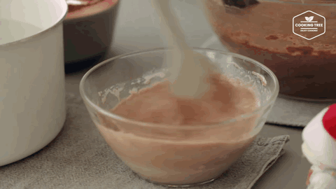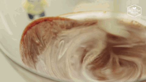 ▲拿出泡在热水牛奶黄油液,取一抹刀可可面糊到牛奶液中搅拌均匀;