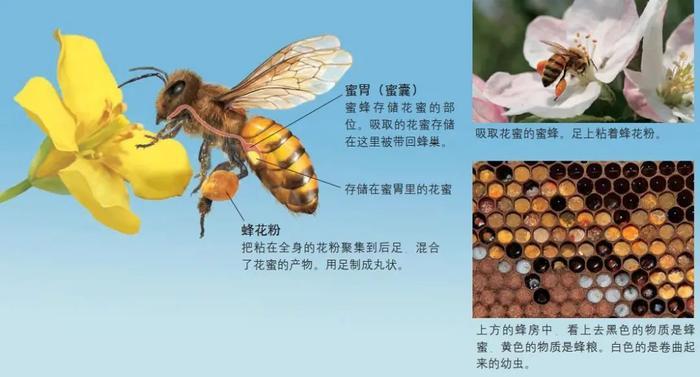 蜜蜂吸取的花蜜存储在肠道之前的蜜胃(蜜囊)中,因此不会消化。此外,蜜蜂把黏在身体上的花粉聚集在后足上,和花蜜混合起来制成丸状带走。蜜蜂带回蜂巢的花蜜和花粉,传给蜂巢内的工蜂存储到蜂房里,最终变成蜂蜜和蜂粮。