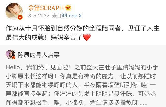 而陈辰的老公余笛也发文感慨老婆作为高龄产妇的不容易:“作为从十月怀胎到自然分娩的全程陪同者,见证了人生最伟大的成就!妈妈辛苦了。”看出夫妻感情非常好。