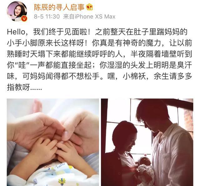 陈辰表示:“Hello,我们终于见面啦!之前整天在肚子里踹妈妈的小手小脚原来长这样呀!”