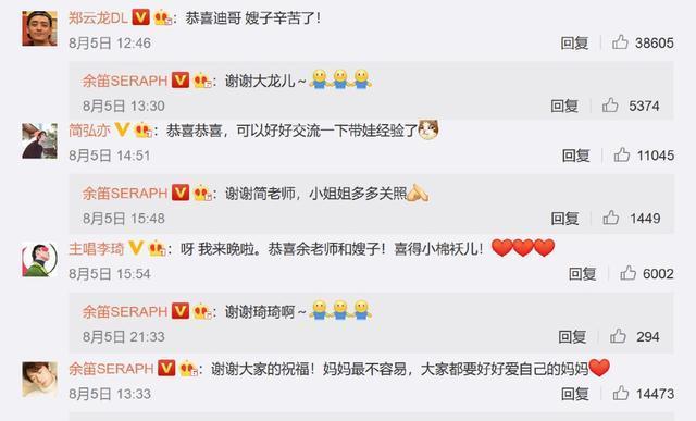 郑云龙表示:“恭喜迪哥,嫂子辛苦了!”简弘亦则称:“可以好好交流一下带娃经验了。”歌手李琦送祝福:“恭喜余老师和嫂子!喜得小棉袄儿!”