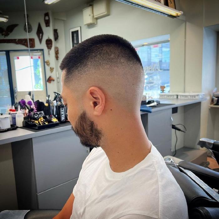 圆寸头可以说是很有硬汉风采的一款发型,对于胡子比较浓密的男士来说,搭配起来,效果也是很有范儿,更能彰显男人的魅力。