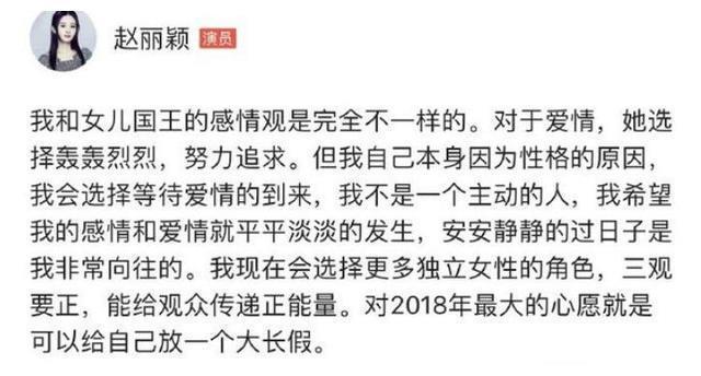 赵丽颖曾在电影《女儿国》中评价过爱情观,她说和国王的爱情观有很大的不同。她喜欢朴实的爱情,不会主动的追求,而冯绍峰的性格就是安静谦逊的绅士。