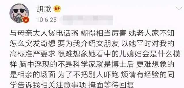 对于母亲选儿媳像选美般要求众多,胡歌十分无奈,但随着母亲的身体越来越差,胡歌的年纪也越来越大,对他女朋友的条件逐渐降低,但胡歌貌似已经不再想着恋爱了。
