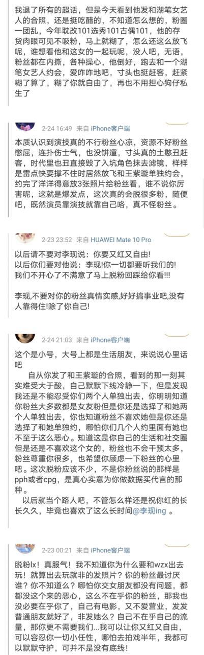 脱粉的粉丝表示,李现为什么要单独和女艺人王紫璇一起出去?难道不知道自己有很多女友粉吗?他这样做会让很多女友粉很伤心。还有粉丝表示,李现谈恋爱都没有问题,就是不可以发和王紫璇的合影,不知道这对合作伙伴到底怎么就不能够一起玩了?甚至于,有粉丝说,看到李现和王紫璇的合影,没有吃醋,更多的是难过。难过的是,李现都快要糊了,却还不好好搞事业,还不努力营业,去和自己的朋友约会见面。粉丝扬言,可以让他又红又自由,但并不是没有底线。