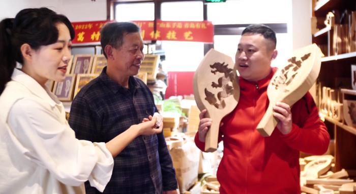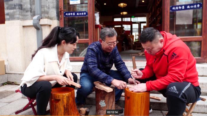 文哥探店,则提前以探寻视角,趣味介绍了葛村榼子,带领人们走进这项非遗及传承人的生活,还在直播中与主持人一起跟随王承厚师傅学习榼子的雕刻技艺。