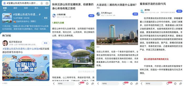其中,以#宝藏山东成为非遗传人是什么体验# 话题为例,在百度APP济南、青岛、潍坊、临沂四频道上线近一周时,已有不少网友通过图文、视频打卡齐鲁风情,参与话题讨论,发表了自己与这片宝藏大地的故事。