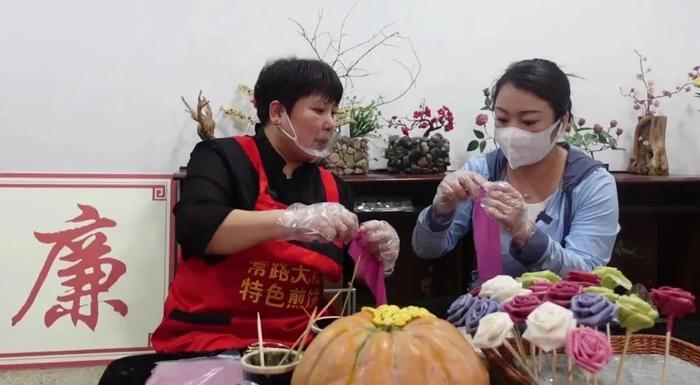 临沂导游冰冰,在直播前便通过充满怀旧色彩的场景化展示,向人们普及了煎饼的历史和故事,并由此引出了将生活的烟火气提升到美学层次的“煎饼花”手艺。在手艺人徐海霞手中,一张张煎饼也绽放为姹紫嫣红,姿态各异的“鲜花”。