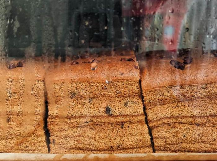 刚出炉的蛋糕就被整整齐齐摆进了玻璃柜里,水蒸气凝聚在玻璃上,氤氲水雾给蛋糕也加上了一层滤镜,店内的空气都透着清甜。不大的玻璃柜里放着几款蛋糕,有芋泥、巧克力、抹茶红豆、原味和芝士等口味可选择,因为蛋糕卖得快,所以玻璃柜总有几格是空的。