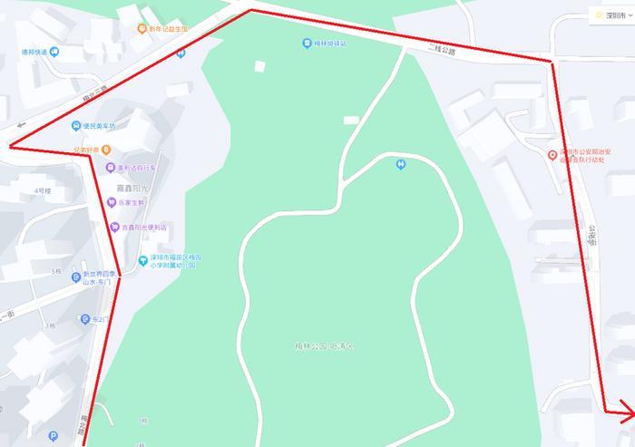 新活力花园小区边,是梅林路与梅北路的交叉口,由此进入梅北路,沿着梅北路——梅北三路——公安街。