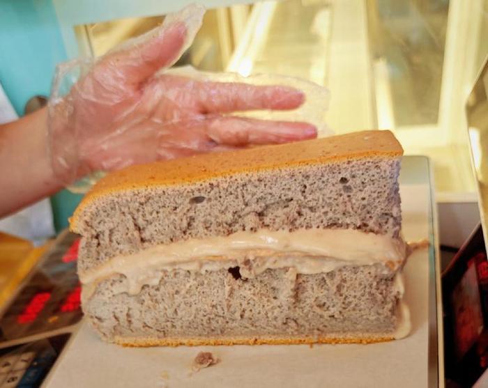 芋泥口味的蛋糕是最受欢迎的一款,两块蛋糕体夹着一层厚厚芋泥,湿润绵密的蛋糕与甜而不腻的芋泥仿佛天生一对,细细品尝,还能吃到芋泥中夹杂着的芋头粒。