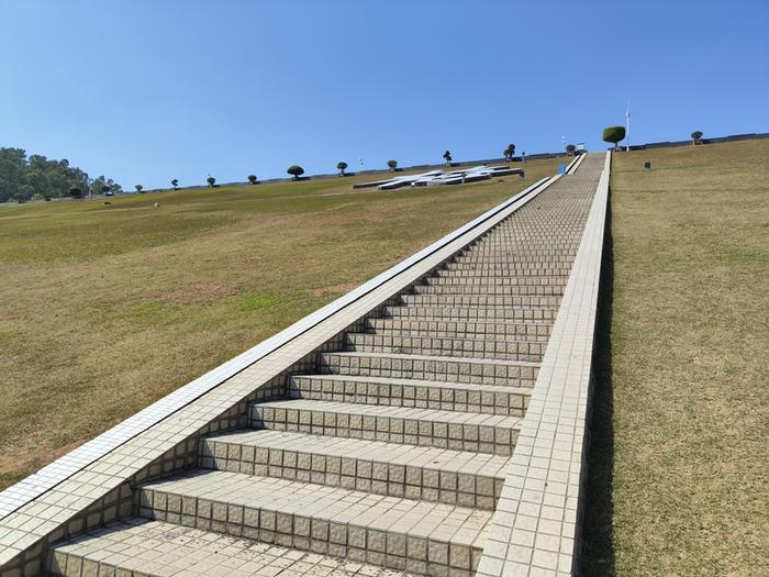 沿着好像连接天空的阶梯,登上坝区步行道,一面可望水映山,水面在阳光下格外澄明平静;一面可躺坐斜坡,看风拂过草木的荣枯,将大部分梅林尽收眼底。
