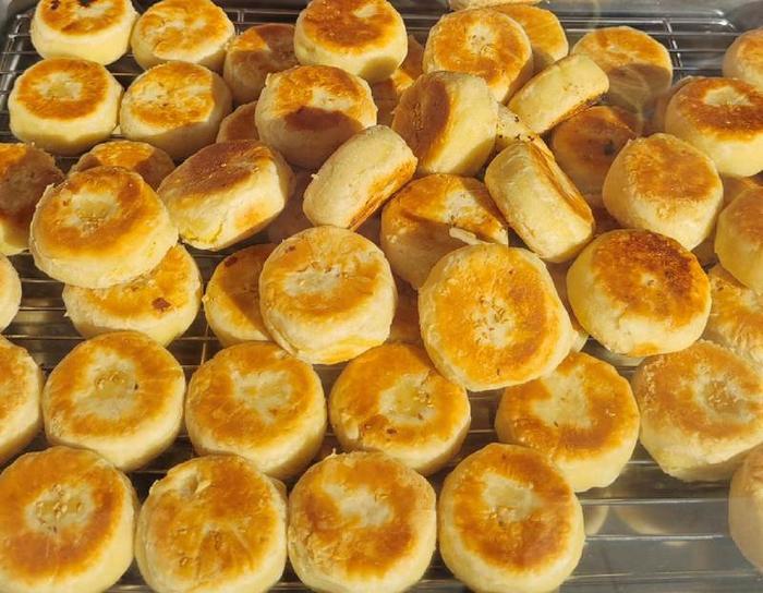 新鲜出炉的绿豆饼拿在手里还是滚烫的,金黄外皮包裹着满满的绿豆蓉,外皮酥脆内馅清甜,一口咬下去大满足。