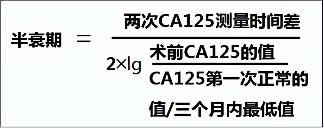 CA125的半衰期,通俗的来讲就是患者手术或化疗后血清CA125的下降速度,计算公式是:半衰期=dt/[2×lg(CA1/CA2),其中CA1为患者手术前CA125的数值;CA2为CA125化疗期间第一次降到正常范围(35U/ml)的值(或化疗的3个月内降至最低的值);dt是CA1及CA2之间的时间[3]。
