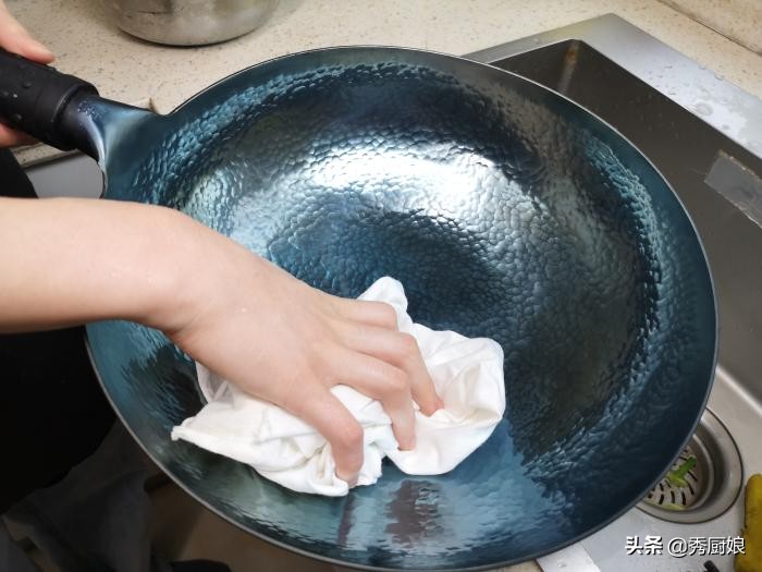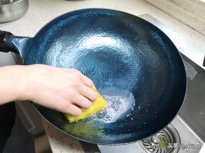 第一步:买回家的新铁锅,将包装拆掉后,放入适量的洗洁精,用海绵擦洗一下,再用温水清洗干净。然后将水倒出,用干净的抹布,擦干锅体的水分,包括锅底的水分也要擦干。