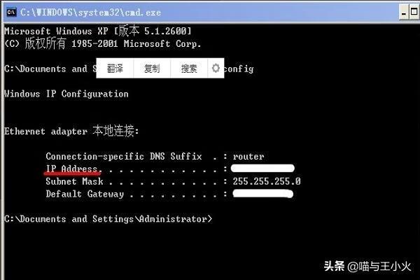 4、主机IP查看:主机电脑右下角点击,开始-运行输入CMD回车,在命令提示符中键入ipconfig回车,这时就会看到你的主机ip。或者网上查询自己的主机ip也可以