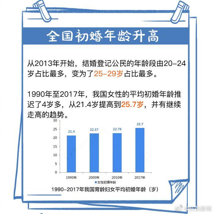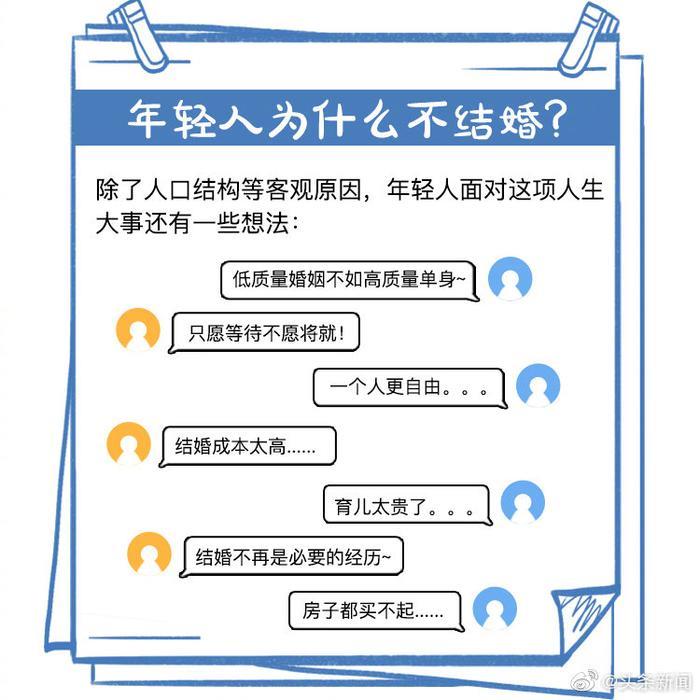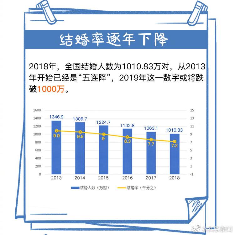引发热议。2013年起,受人口结构、经济、教育等因素影响,中国结婚率已是“五连降”,初婚年龄持续上升。这届年轻人为什么不结婚?或许比起下调准婚年龄,对症下药才可改善。@新浪图解天下