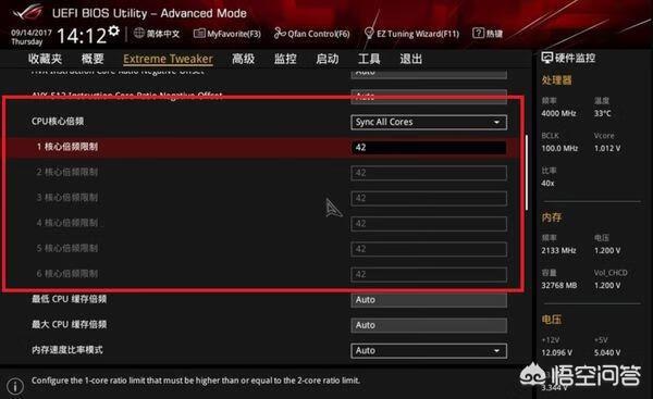 3、将“CPU核心倍频”的Sync All Cores(同步所有核心)拉开,默认状态下是AUTO,可以根据经验来进行尝试,输入42,就代表CPU主频调节至了100*42=4200MHz=4.2GHz。