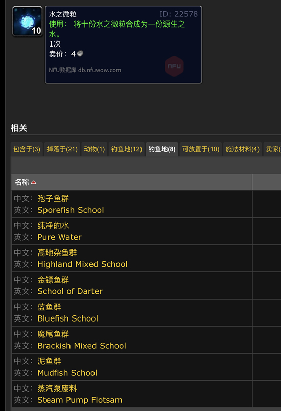 第二名当属水之微粒了,虽然很多鱼群都能钓到它,水之微粒鱼点主要还是集中在纳格兰,本人运气最好的时候在这里一个鱼点出了8个!和以前的元素之水点一样,它也是有刷新周期的,而且一个湖最多只出一个点,每个点能下2~4竿。