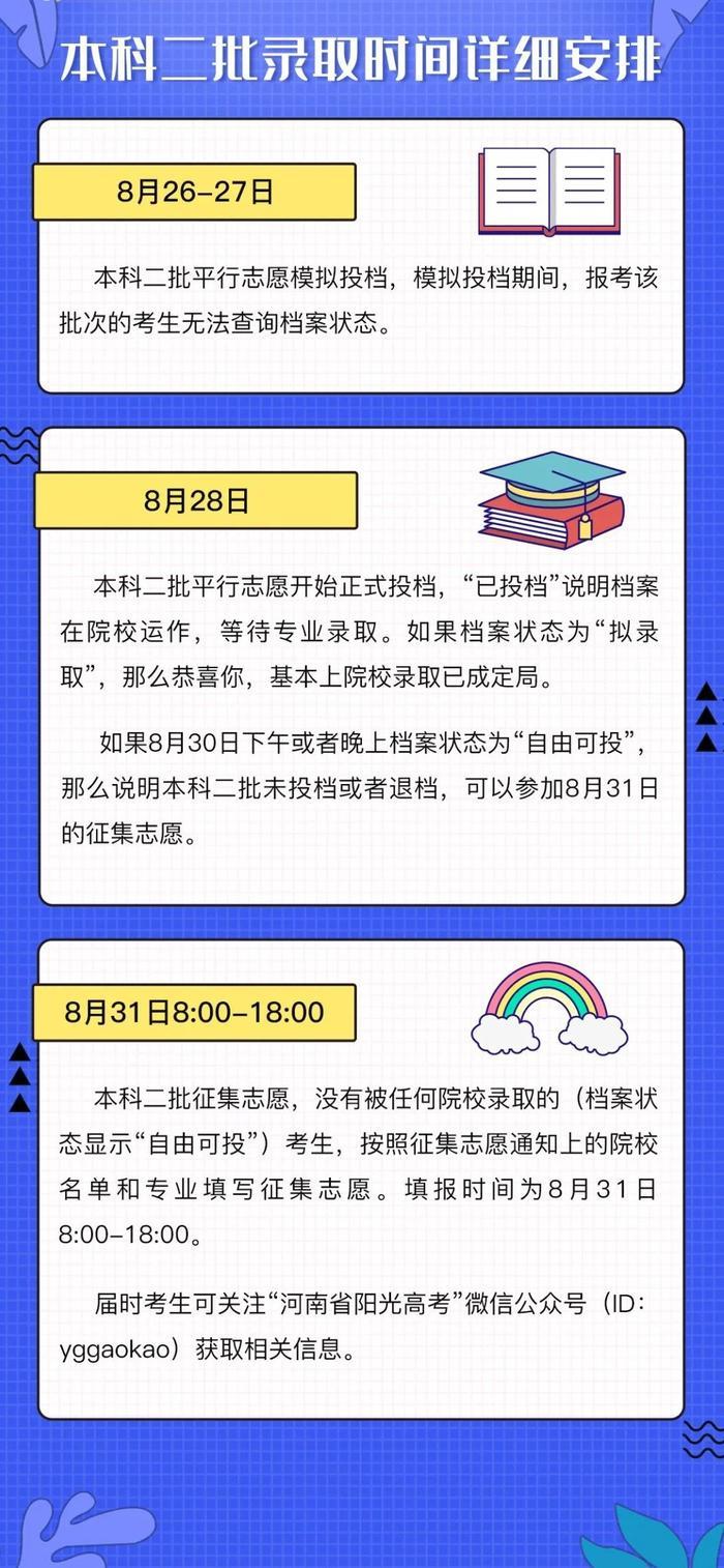8月26日,河南省2020年高招本科二批开始录取,录取时间为8月26日-8月30日,本批次实行平行志愿投档模式,正式投档前将先进行数轮模拟投档,8月31日8:00-18:00,本科二批征集志愿哪些院校参与本次录取工作?本次录取时间安排具体是怎样的?一起往下看!