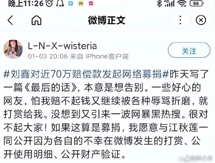 然而,过了一段时间,她卷土重来。在2022年1月,江秋莲起诉了刘鑫的生命权纠纷案,一审判决刘鑫赔偿江秋莲经济损失49.6万元,并支付20万元的精神抚慰金。为了筹集这笔款项,刘鑫换了昵称重新注册了微博,并开始募集资金。账号一开通就收到了700多次的打赏,她很快就筹集到了赔偿款的金额。