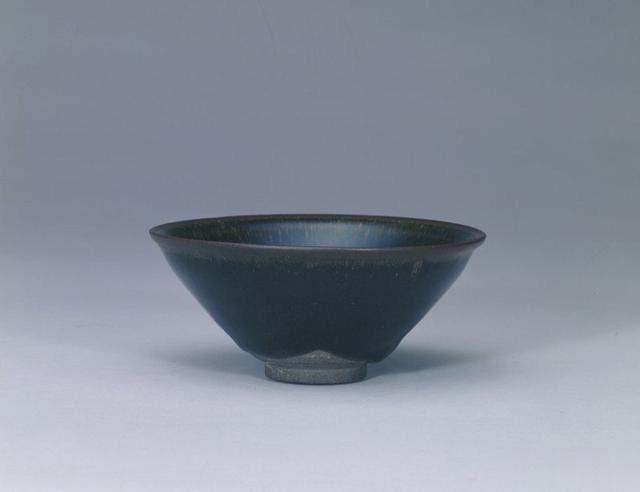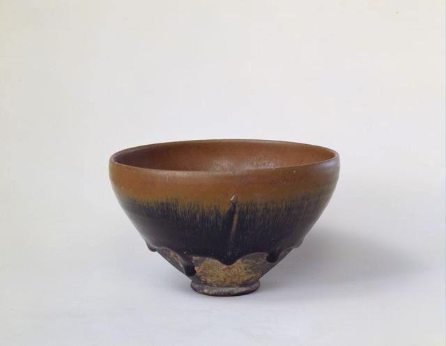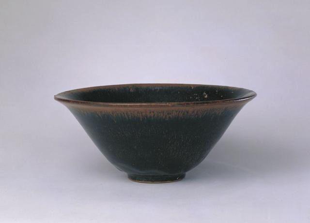 宋,高5.8厘米,口径12.8厘米,足径3.9厘米。盏撇口,斜直壁,小圈足。胎呈铁黑色,里满釉。外施釉不到底,腹下部釉垂流如泪痕。碗口釉呈酱色,口下渐为褐黑相间,近里心为纯黑色。撇口建盏:口沿外撇,唇沿稍有曲折,斜腹,浅圈足,可分大、中、小型。