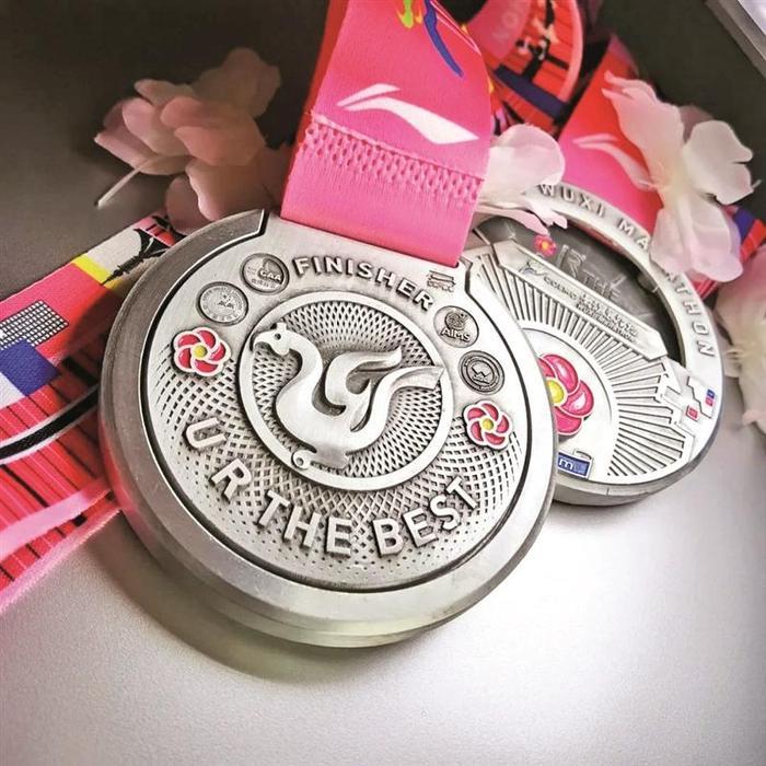 无锡马拉松被誉为“春天第一跑”,跑友们又亲切地称之为“樱花马”,因为比赛的季节正值全城樱花烂漫。即便今年的锡马延期到了秋天,完赛奖牌《绽放》依然少不了樱花。奖牌正面首先映入眼帘的便是一朵绽放的樱花,上半部分还有一个特别的凹窝,如一汪清浅的湖水,静静漂浮着点点樱花。奖牌的背面则是无锡的城市徽标“玉飞凤”,代表着这座古老城市的历史传承与文化底蕴。