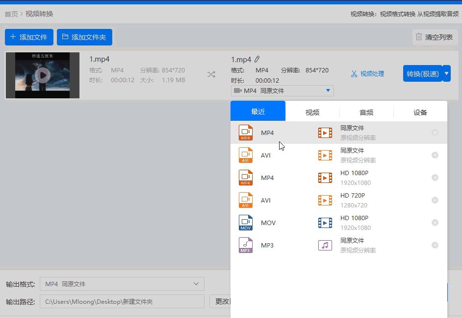 支持主流视频格式转换:MOV、AVI、MP4、WMV、M4V等多种格式,将视频添加进去,选择需要转换的格式转换。