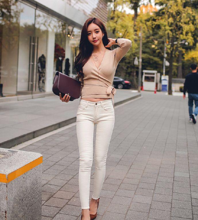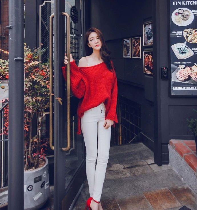 红衣配白裤,完美的身材比例,精致的五官,太美了
