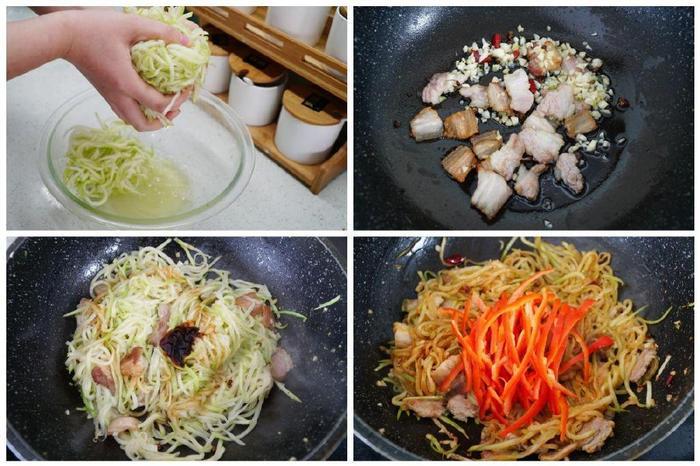 2、五花肉切片,炒锅中加入少量的油,加入五花肉片,等到五花肉中的部分油脂析出,加入蒜末、干辣椒和姜末炒出香味。