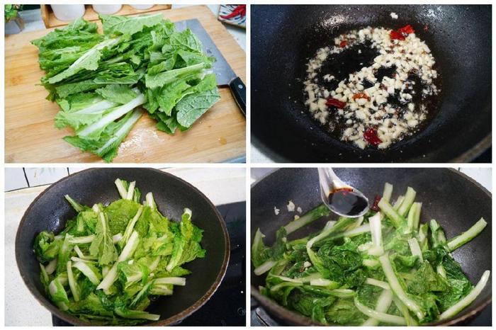 4、小白菜断生后倒入一勺生抽、少量的盐和鸡精搅拌均匀后,即可出锅。