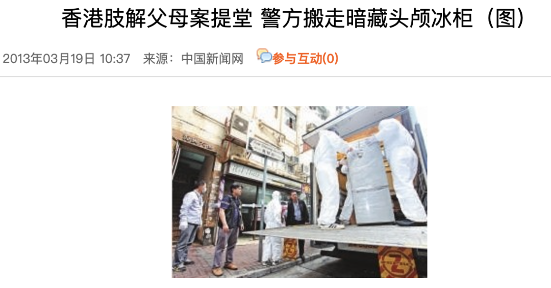 2013年香港发生的大角咀双尸案,凶犯周凯亮携好友谢臻麟,策划、谋杀自己的亲生父母,杀人后分尸,并将残肢冷冻于冰柜之中。