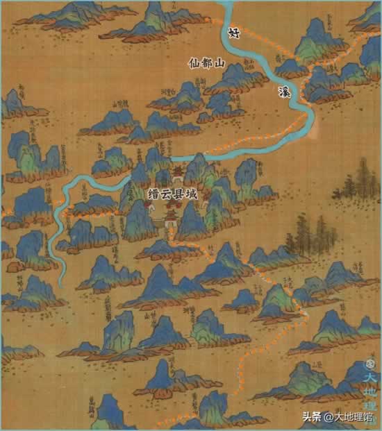 |清代缙云县地图(局部),蓝色为河流,橙色为驿道。方向为“上南下北”|
