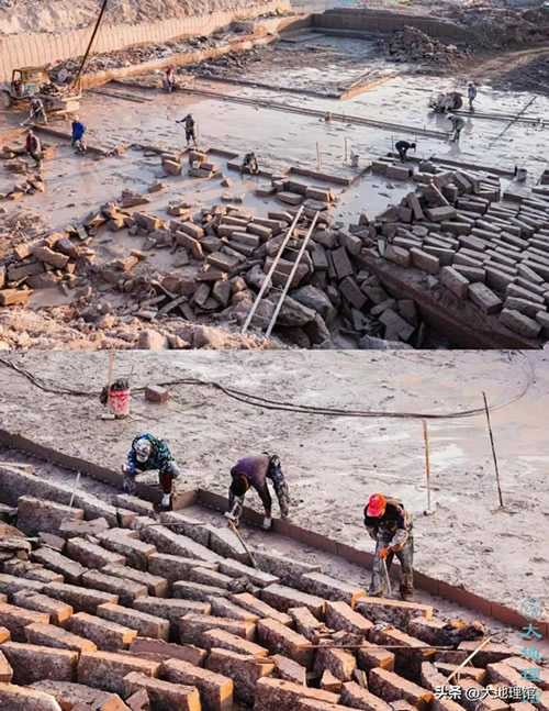 |缙云人就地取材,擅长用条石建设家园,图为地面铺设作业现场|