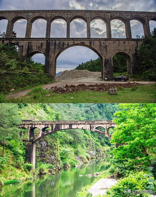 |上图古方胜利渡槽,颇有古罗马时期渡槽的味道。下图是一座跨度超过百米的石拱桥|
